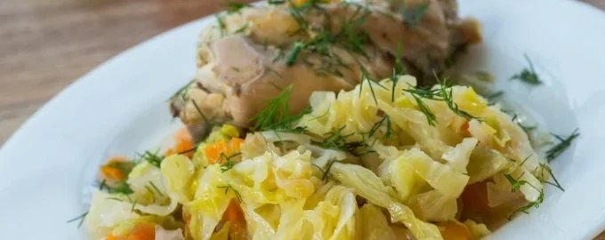 - Βάλτε το λάχανο, τα κρεμμύδια, τα καρότα σε ένα μπολ, προσθέστε αλάτι, φύλλο δάφνης, ρίξτε φυτικό λάδι, ανακατέψτε και βάλτε το σε ένα μανίκι ψησίματος, από πάνω το μαριναρισμένο κρέας και κομμάτια βουτύρου, δέστε το μανίκι και από τις δύο πλευρές και μεταφέρετε το σε ένα ταψί.