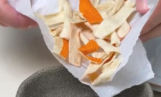 - Μεταφέρετε τα ζουλιέν σε ένα ταψί με λαδόκολλα. Μπορείτε να βάλετε δίπλα τους τις πατάτες σε φέτες. Ψήστε στους 180°C για 35-40 λεπτά. Ενεργοποιήστε το convection 10 λεπτά πριν από την ώρα που θα είναι έτοιμο, ώστε το μπέικον να γίνει τραγανό και η γεύση του να γίνει πιο έντονη.