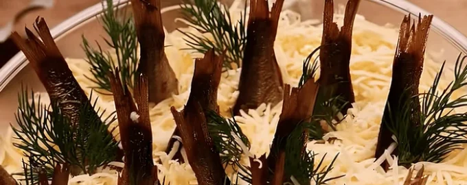- Συναρμολογήστε τη σαλάτα, αλείφοντας κάθε στρώση με μια ελαφριά στρώση μαγιονέζας: πατάτες, σπρέτ, κρεμμύδια τουρσί, καρότα, αυγά και τυρί.