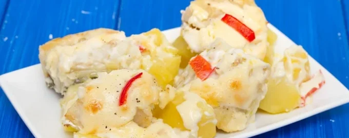 Τοποθετήστε κομμάτια μπακαλιάρου ανάμεσα σε στρώσεις πατάτας, απλώστε τα κρεμμύδια, προσθέστε ξινή κρέμα και χυμό λεμονιού για ζουμερότητα, πασπαλίστε με τυρί και ψήστε στο φούρνο.